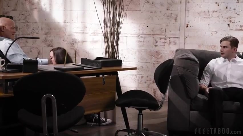 Ed fucks Becky's mouth, then puts her on his desk so he can fuck her pussy, all as Doug watches. After Ed is done, he tells Doug that now it's HIS turn to have sex with Becky. Doug is stunned, and Ed reminds him that he's supposed to be shadowing him all day, and doing EVERYTHING that he does. After some initial hesitation, Doug agrees. Doug's first lesson in becoming more like Ed is about to begin...